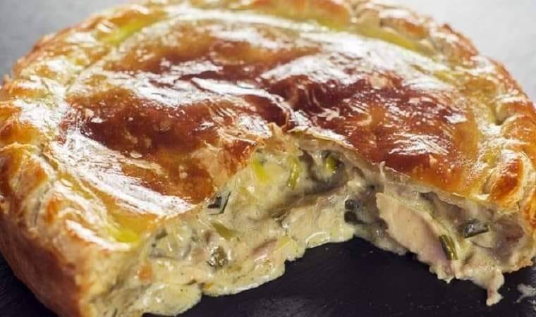 - A l’aide d’une pointe de couteau, et des chutes de pâte, décorer la tourte. Badigeonner de jaune d’œuf et cuire environ 20 minutes à 200° sans préchauffer le four.