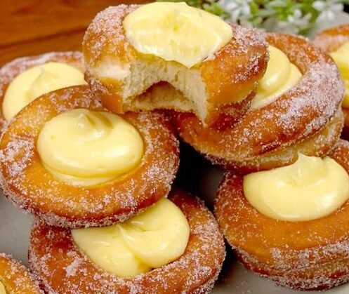 DONUTS A LA CREME Ingrédients : 90 ml d’eau chaude 150 ml de babeurre 1 œuf 50 g de beurre fondu 500g de farine 50g de sucre 7g de levure …