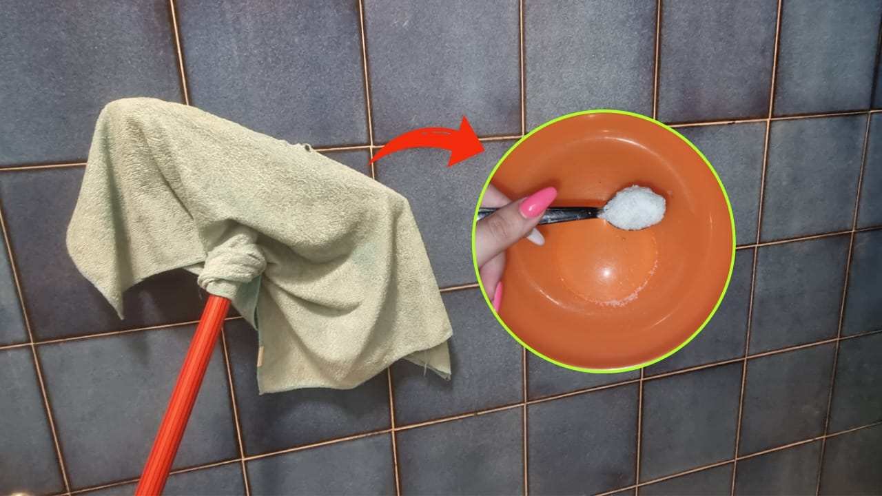 À ce stade, nous pouvons tremper le chiffon dans la solution eau-vinaigre et l’essorer légèrement pour qu’il ne soit pas trop mouillé. Ensuite, nous plaçons le chiffon sur le balai et le fixons à l’aide de l’élastique pour qu’il reste bien attaché. Nous pouvons ensuite passer le balai avec le chiffon mouillé sur les carreaux de la salle de bains, en insistant sur les zones les plus sales ou tachées.