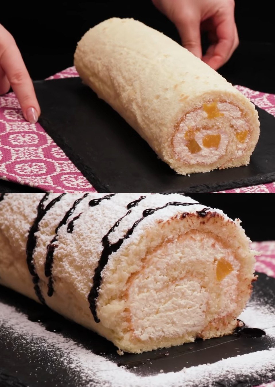 4. répartir la pâte sur une plaque recouverte de papier sulfurisé et faire cuire à 200°C pendant 10 à 15 minutes.5. renverser le biscuit sur un torchon humide, retirer le papier sulfurisé et retourner le biscuit sur un autre torchon. 6. répartir ensuite la garniture sur le biscuit et enrouler délicatement le gâteau à l’aide du torchon. Saupoudrer le biscuit roulé d’un peu de sucre glace, le dresser et le servir.