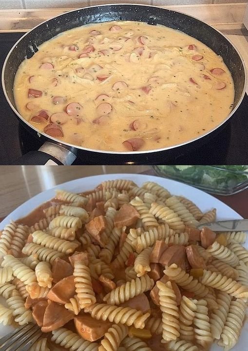 - Tout d’abord, couper les saucisses en morceaux et l’oignon en rondelles. Hacher également l’ail. Faites revenir le tout dans une poêle avec un peu d’huile pendant cinq minutes, jusqu’à ce que l’oignon devienne transparent.