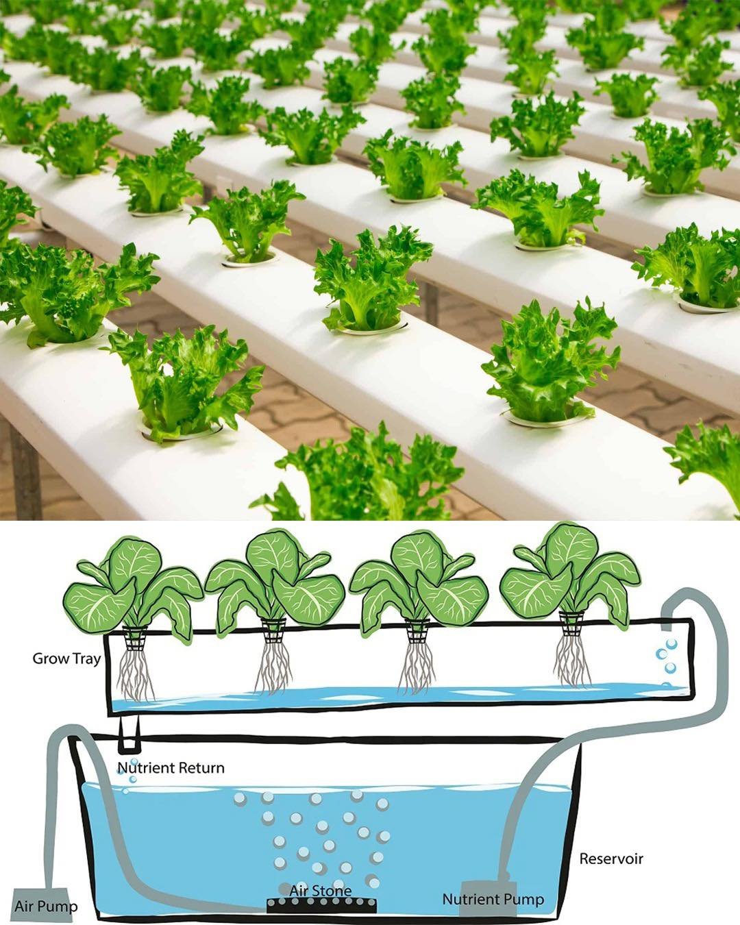 - Aéroponie: Les racines sont suspendues dans l’air et sont aspergées d’une solution nutritive.