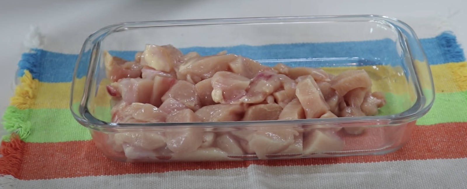 2. Lavez et coupez les filets de poulet en petits morceaux, puis placez-les dans un plat allant au four.