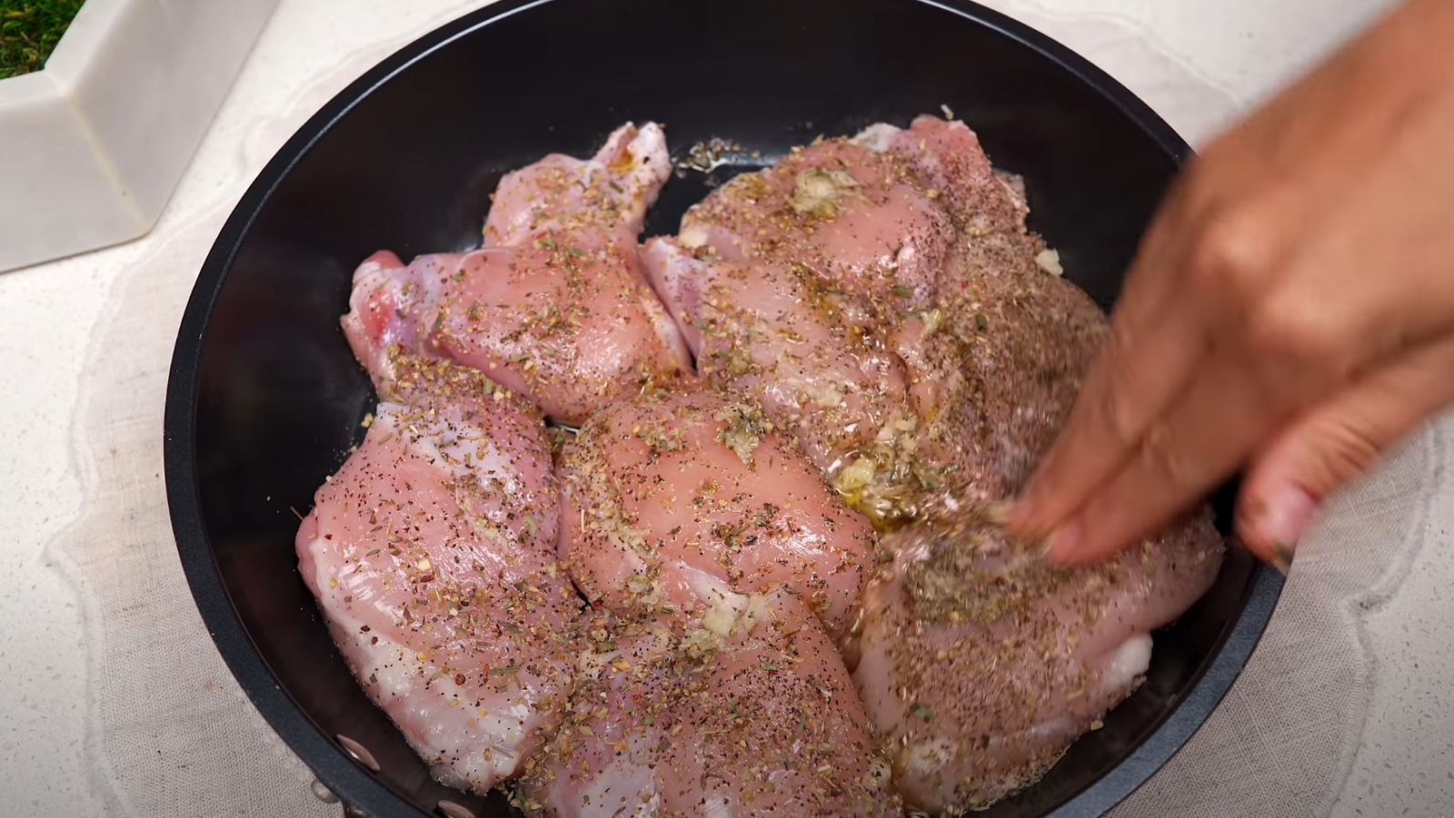 1. Retirer la peau des cuisses de poulet et les placer dans un plat allant au four. Saler et assaisonner avec les herbes de Provence.